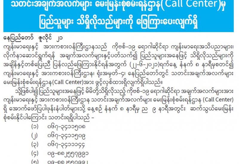 မြန်မာ့အသံနှင့် ရုပ်မြင်သံကြားမှ ဇူလိုင် ၂၀ ရက် ည ၈ နာရီ သတင်းအပြီးတွင် ထုတ်လွှင့်ပြသခဲ့သည့် ကိုဗစ် -၁၉ ရောဂါကာကွယ်ထိန်းချုပ် ရေးဆိုင်ရာဆောင်ရွက်ချက်များ အကြောင်း သိကောင်းစရာအစီအစဉ်ကို ပြည်သူများသိရှိနိုင်ရန်အတွက် ပြန်လည်ဖော်ပြလိုက်ပါသည်။