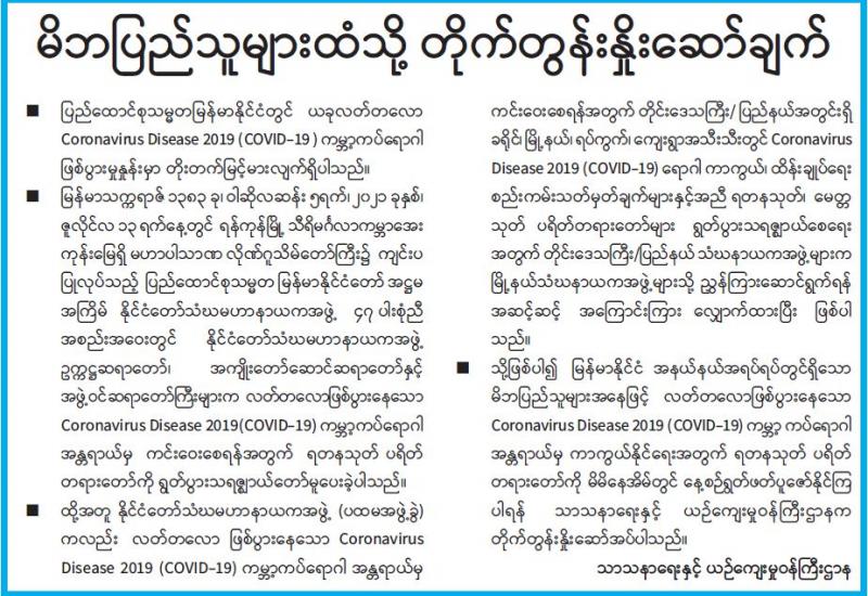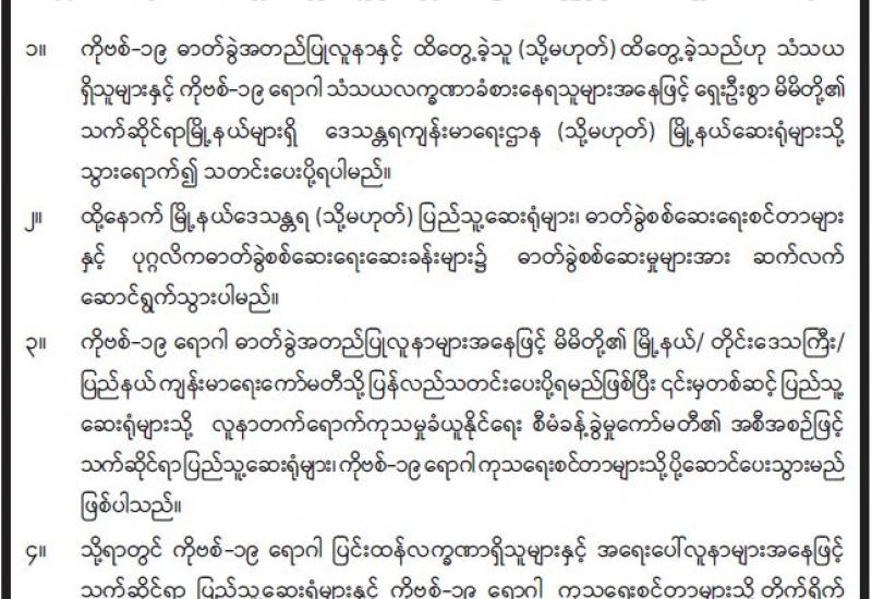 ကိုဗစ်-၁၉ ရောဂါ တတိယလှိုင်း ဖြစ်ပွားလျက်ရှိပြီး ရောဂါကူးစက်ပြန့်ပွားမှုမှာ နေ့စဉ်မြင့်တက်လျက်ရှိသောကြောင့် ရောဂါကူးစက်မှုမခံရစေရေးအတွက် နေပြည်တော်ကောင်စီ နယ်မြေ၊ ရှမ်းပြည်နယ်(မြောက်ပိုင်း)၊ လားရှိုးမြို့၊ ဧရာဝတီတိုင်းဒေသကြီး၊ ပုသိမ်မြို့နှင့် ပဲခူးတိုင်းဒေသကြီး၊ တောင်ငူမြို့များ၌