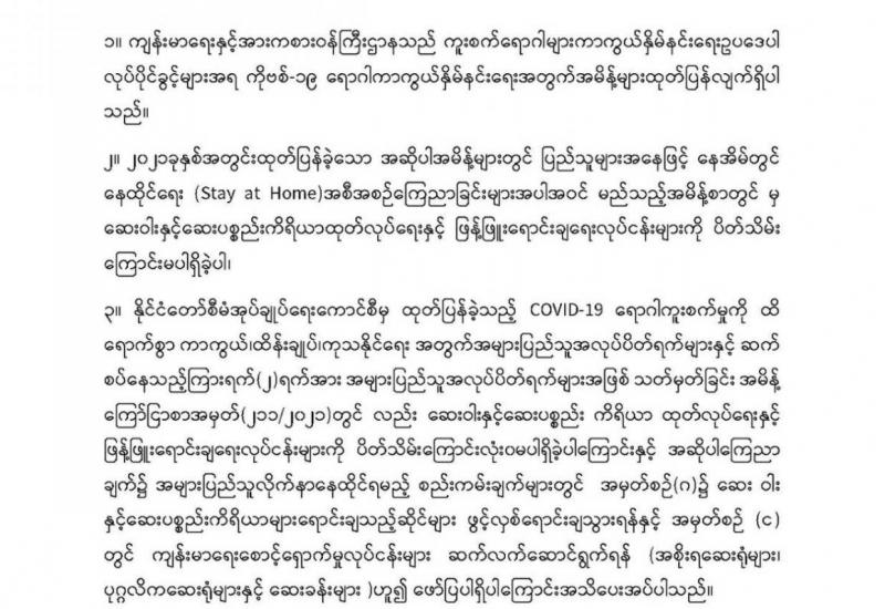 COVID-19 ရောဂါတတိယလှိုင်း ဖြစ်ပွားလျက်ရှိပြီး ရောဂါကူးစက်ပြန့်ပွားမှုမှာ နေ့စဉ်မြင့်တက် လျက်ရှိသောကြောင့် ရောဂါကူးစက်မှုမခံရစေရေးအတွက် နေပြည်တော် ကောင်စီနယ်မြေ၊ ကချင် ပြည်နယ်၊ ဧရာဝတီတိုင်းဒေသကြီး၊ မန္တလေးတိုင်းဒေသကြီးနှင့်