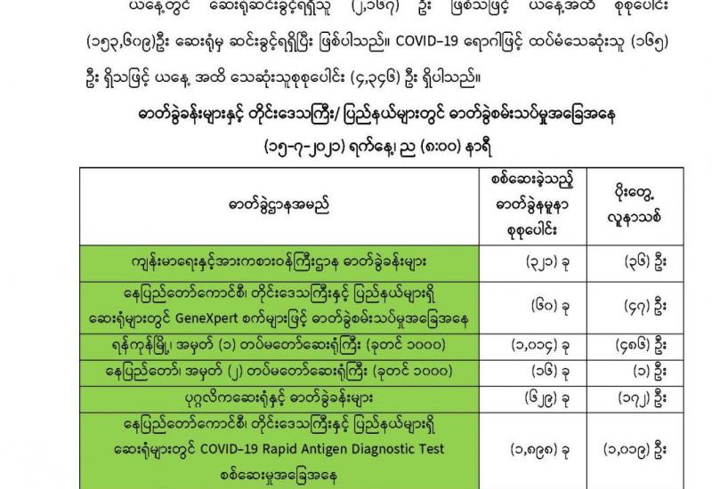 ကိုဗစ်-၁၉ကပ်ရောဂါသည် အရှိန်အဟုန်ကောင်းနေသည်။ ဇူလိုင် ၁၄ရက်ကရောဂါ ကူးစက်ဖြစ်ပွားမှုတွင် ဓာတ်ခွဲစစ်ဆေး အတည်ပြုပိုးတွေ့လူနာ ခုနစ်ထောင်ကျော် ရှိပြီး သေဆုံးလူနာ ၁၅၀ ခန့်ဖြင့် လွန်ခဲ့သည့်နေ့ထက် နှစ်ဆတိုး ဖြစ်ပေါ်ခဲ့သည်။ ယင်းအခြေအနေသည် ဆေးရုံတက် စစ်ဆေးကုသမှု အခြေအနေဖြစ်ပြီး ကိုဗစ်-၁၉ နှင့်ပတ်သက်၍ ရောဂါရှိသည်ဖြစ်စေ၊ တစ်စုံတစ်ရာ သံသယရှိလျှင်ဖြစ်စေ ဆေးရုံသို့ ရောက်မလာနိုင်ဘဲ ရောဂါဖြစ်ပွား၊ သေဆုံးနေကြသူများမှာ ယခုထက်ပင် ပိုမိုများပြားမည်ဟု ခန့်မှန်းရသည်။