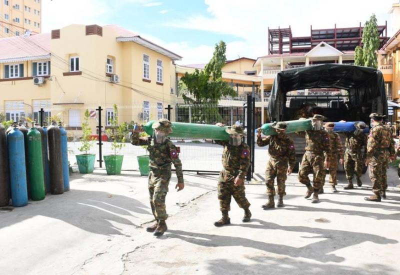 COVD-19 ရောဂါဓာတ်ခွဲအတည်ပြု ပိုးတွေ့ လူနာများကို ကုသရေး လုပ်ငန်းများ ဆောင်ရွက် ရာတွင် အောက်ဆီဂျင်လိုအပ်ချက်များကို တစ်ဖက်တစ်လမ်းမှ အထောက်အကူ ပြုစေရန် အတွက် တပ်မတော် အနေဖြင့် အောက်ဆီဂျင်အိုးများကို ဆေးရုံများနှင့် COVID-19 ရောဂါကုသရေးဌာနများအရောက် သွားရောက်လှူဒါန်းလျက်ရှိသည်။