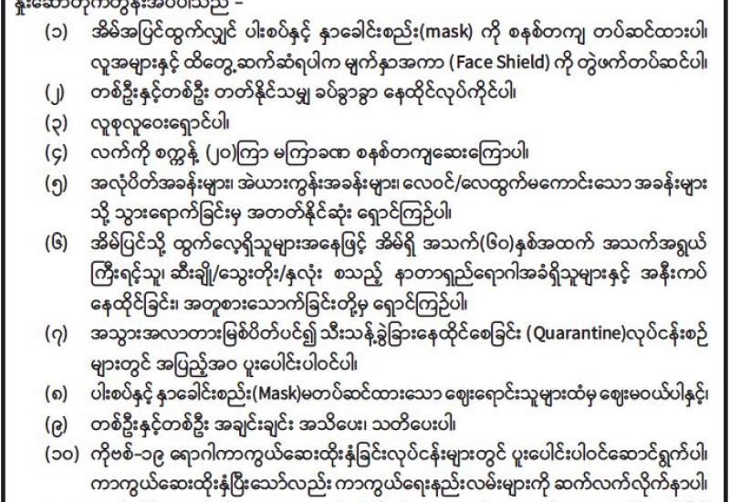 မြန်မာ့မီးရထားက ပြည်သူများ ခရီးသွားလာမှု လွယ်ကူအဆင်ပြေ စေရေးနှင့် ကုန်စည်များပို့ဆောင်နိုင်ရေး စီစဉ်ဆောင်ရွက်ပေးလျက်ရှိရာ ရထားလမ်းပိုင်းအသီးသီးတွင် လူစီးရထားများ ပြေးဆွဲပေးခြင်းကိုကျန်းမာရေးနှင့် အားကစားဝန်ကြီးဌာန၏ လမ်းညွှန်ချက်နှင့်အညီ ဘူတာအဝင်နှင့် ရထားများပေါ်တွင် ခရီးသည်များ၏ ကိုယ်အပူချိန် တိုင်းတာခြင်း၊ ဘူတာအဝင်ရှိ လက်ဆေးခုံများတွင် လက်ဆေးစေခြင်း၊ Mask တပ်ပြီး ဘူတာအတွင်းနှင့် ရထားပေါ်သို့ တက်ရောက်စေခြင်း၊ Social Distancing အတွက်တွဲများပေါ်တွင် နှစ်ယောက်ထိုင်နိုင်သောထိုင်ခုံ တစ်ခုံ၌ ခရီးသည်တစ်ဦးသာ ရောင်းချစေခြင်း၊ သတ်မှတ် ခရီးသည်ဦးရေမှ အပထိုင်ခုံမဲ့ လုံးဝမရောင်းစေခြင်းတို့ကို စီစဉ်ဆောင် ရွက်ပေးလျက်ရှိသည်။