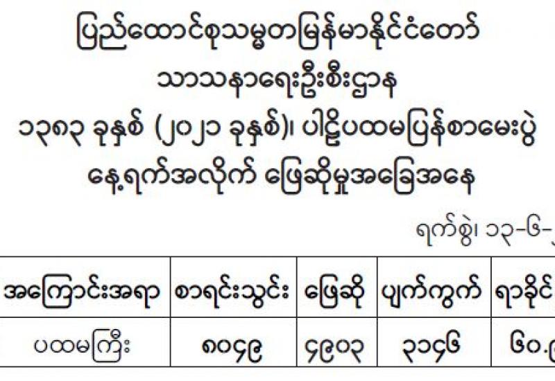 သာသနာရေးနှင့်ယဉ်ကျေးမှုဝန်ကြီးဌာန၊ သာသနာရေးဦးစီးဌာနကကြီးမှူး၍ နှစ်စဉ်ကျင်းပ ပြုလုပ်သော ၂၀၂၁ ခုနှစ် ပါဠိပထမပြန်စာမေးပွဲ (ပထမကြီး) သတ္တမနေ့ကို ဇွန် ၁၃ ရက်၌ နိုင်ငံ တစ်ဝန်းလုံးရှိ စာဖြေဌာန ၂၄၁ ဌာနတို့တွင် စာရင်းသွင်းသံဃာနှင့် သီလရှင် စုစုပေါင်း ၈၀၄၉ ပါး အနက် ၄၉၀၃ ပါး ဖြေဆိုကြသဖြင့် ၆၀ ဒဿမ ၉၁ ရာခိုင်နှုန်း ဖြေဆိုကြကြောင်း သာသနာရေး ဦးစီးဌာနမှ သိရသည်။