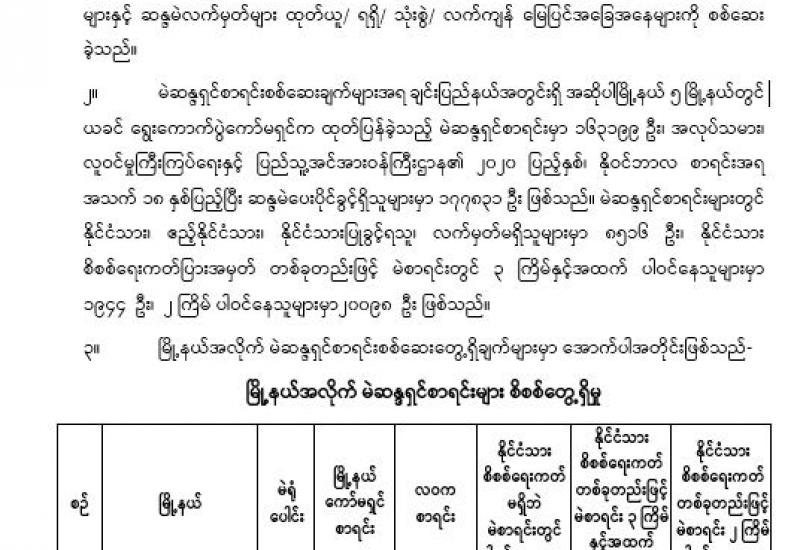 (၂၆-၅-၂၀၂၁) ရက်နေ့၊ ည (၈:၀၀) နာရီမှ (၂၇-၅-၂၀၂၁) ရက်နေ့၊ ည (၈:၀၀) နာရီအတွင်း ဓာတ်ခွဲနမူနာစုစုပေါင်း (၁,၇၈၈) ခုအား စစ်ဆေးပြီးစီးခဲ့ရာ COVID-19 ရောဂါ ဓာတ်ခွဲအတည်ပြု လူနာသစ် (၉၆) ဦး တွေ့ရှိရပါသည်။ သို့ဖြစ်ပါ၍ ယနေ့အထိ ဓာတ်ခွဲနမူနာ စုစုပေါင်း (၂,၆၁၆,၄၆၆) ခု အား စစ်ဆေးခဲ့ပြီး COVID-19 ဓာတ်ခွဲအတည်ပြုလူနာ စုစုပေါင်း (၁၄၃,၄၁၄) ဦး ရှိပြီ ဖြစ်ပါသည်။