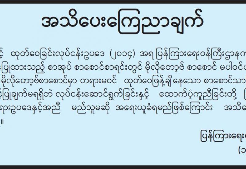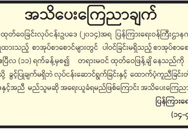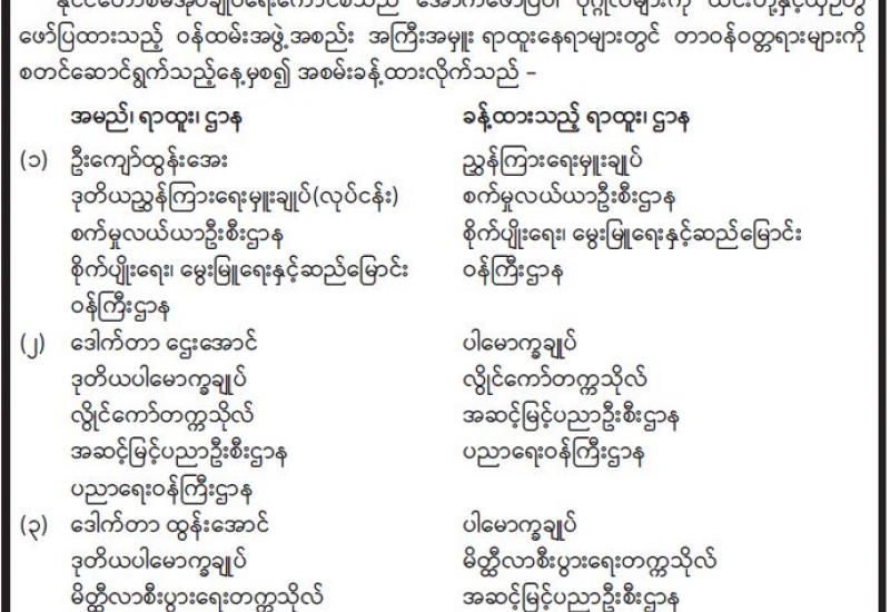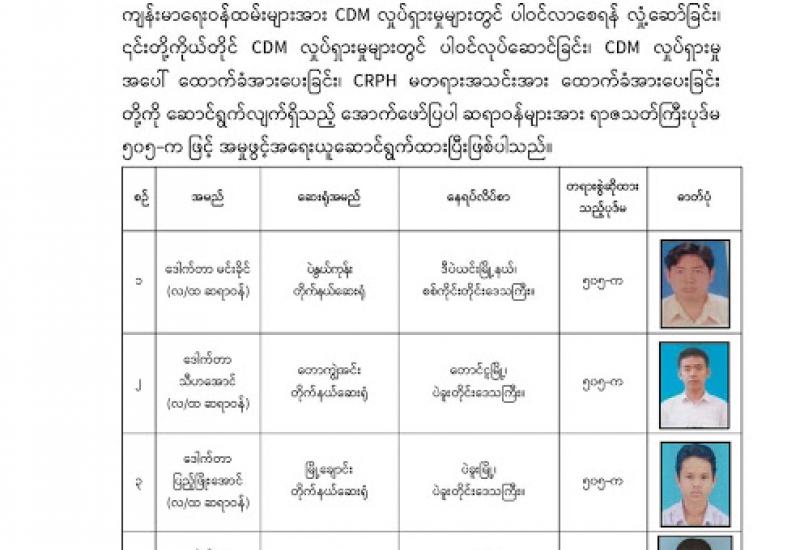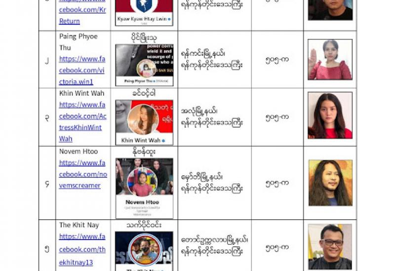 နိုင်ငံတော်၏ အုပ်ချုပ်မှုယန္တရားပျက်ပြားစေရန်ရည်ရွက်ချက်ဖြင့် နိုင်ငံ့ဝန်ထမ်းများအား CDM လှုပ်ရှားမှုတွင် ပါဝင်စေရန် လှုံ့ဆော်ခြင်း၊ CRPH မတရားအသင်းအား ထောက်ခံသည့် အကြောင်းအရာများ၊ မမှန်သတင်းများအား ဖြန့်ဝေခြင်း၊ နိုင်ငံတော်တည်ငြိမ်အေးချမ်းမှုကို ပျက်ပြားစေပြီး ဆူပူအုံကြွမှုဖြစ်ပေါ်စေရန်နှင့် အများပြည်သူ အထိတ် တလန့်ဖြစ်စေရန် အတွက် သွေးထိုးလှုံ့ဆော်မှုများပြုလုပ်ခြင်း၊ Social Pumishment ပြုလုပ်ခြင်းများကို လူမှု ကွန်ရက် စာမျက်နှာများတွင် ရည်ရွယ်ချက်ရှိရှိ ဖြင့်ဖော်ပြခြင်းနှင့် ဖြန့်ဝေခြင်းများ ဆောင်ရွက် လျက်ရှိသည့် အောက်ဖော်ပြပါ အနုပညာရှင်အချို့နှင့် အခြားပါဝင်ပတ်သက်သူများအား ရာဇသတ်ကြီးပုဒ်မ ၅၀၅-က ဖြင့် အမှုဖွင့် အရေးယူ ဆောင်ရွက်လျက်ရှိကြောင်း ထပ်မံထုတ်ပြန် အပ်ပါသည်။