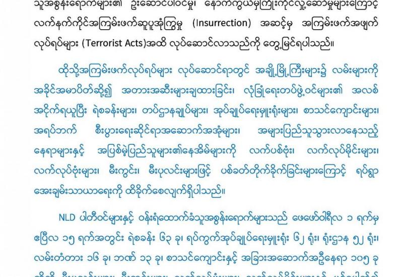 နိုင်ငံတော်အတွင်း မြို့နယ်အချို့၌ ဆူပူအကြမ်းဖက်မှုဖြစ်စဉ်များအား လုံခြုံရေးတပ်ဖွဲ့ဝင်များမှ ဖြိုခွဲထိန်းသိမ်းခဲ့ပြီး ဆူပူအကြမ်းဖက်မှုဖြစ်စဉ်တွင် ပါဝင်သူများအား အကြမ်းဖက်မှုလုပ်ရပ်များတွင် အသုံးပြုသည့် လက်နက်၊ ပစ္စည်း၊ ကိရိယာများ အား သိမ်းဆည်းရမိခဲ့ကြောင်း သိရသည်။
