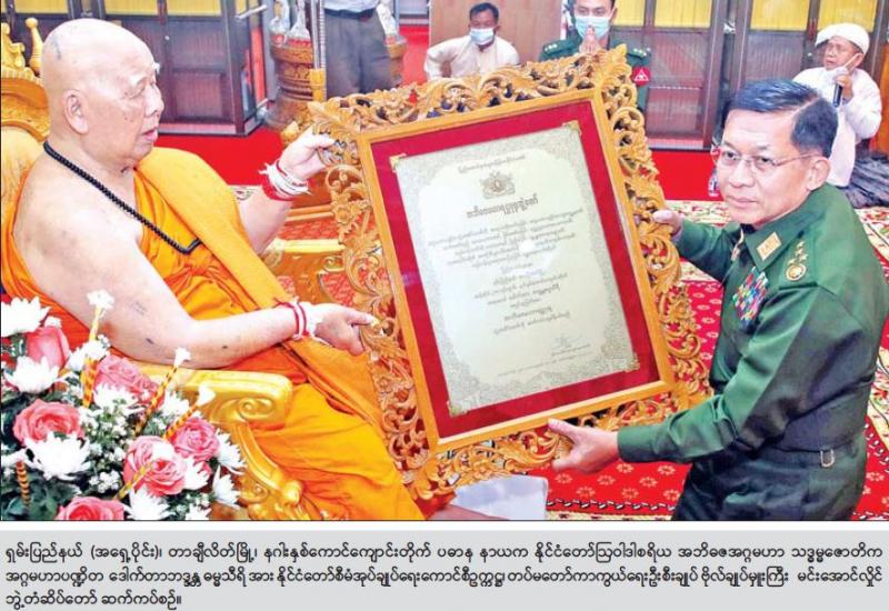 စစ်ကိုင်းတိုင်းဒေသကြီး ရွှေဘိုမြို့ ပခန်းကျောင်းတိုက်ဆရာတော် အဂ္ဂမဟာပဏ္ဍိတ ဘဒ္ဒန္တ ဝိမလာဘိဝံသအား ယနေ့ နံနက်ပိုင်းတွင် နိုင်ငံတော်စီမံအုပ်ချုပ်ရေးကောင်စီအဖွဲ့ဝင်၊ ကာကွယ်ရေးဝန်ကြီးဌာန ပြည်ထောင်စုဝန်ကြီး ဗိုလ်ချုပ်ကြီး မြထွန်းဦးနှင့်အဖွဲ့ဝင်များက သွားရောက်ဖူးမြော်ကြည်ညိုပြီး နိုင်ငံတော်စီမံအုပ်ချုပ်ရေးကောင်စီမှ ဆက်ကပ်သည့် သာသနာတော်ဆိုင်ရာ ဘွဲ့တံဆိပ်ဖြစ်သော အဘိဓဇ အဂ္ဂမဟာသဒ္ဓမ္မ ဇောတိက ဘွဲ့တံဆိပ်အား ဆက်ကပ်ပူဇော်ကာ လှူဖွယ်ပစ္စည်းများ ဆက်ကပ်လှူဒါန်းကြသည်။