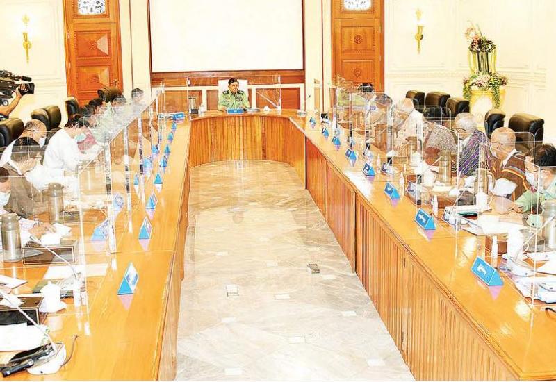 နိုင်ငံတော်စီမံအုပ်ချုပ်ရေးကောင်စီ အစည်းအဝေး (၇/၂၀၂၁)ကို ယနေ့နံနက်ပိုင်းတွင် နေပြည်တော်ရှိ နိုင်ငံတော်စီမံအုပ်ချုပ်ရေးကောင်စီဥက္ကဋ္ဌရုံး အစည်းအဝေးခန်းမ၌ ကျင်းပရာ နိုင်ငံတော်စီမံအုပ်ချုပ်ရေးကောင်စီဥက္ကဋ္ဌ၊ တပ်မတော်ကာကွယ်ရေးဦးစီးချုပ် ဗိုလ်ချုပ်မှူးကြီး မင်းအောင်လှိုင် တက်ရောက်အမှာစကား ပြောကြားသည်။