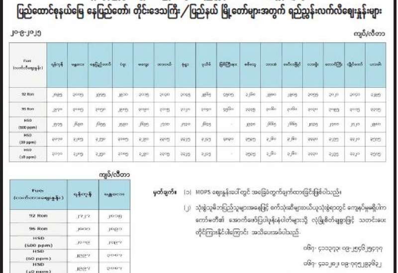 ရန်ကုန်မြို့နှင့် မန္တလေးမြို့အတွက် ရည်ညွှန်းလက်ကားဈေးနှုန်းများနှင့် ပြည်ထောင်စုနယ်မြေ နေပြည်တော်၊ တိုင်းဒေသကြီး/ပြည်နယ် မြို့တော်များအတွက် ရည်ညွှန်းလက်လီဈေးနှုန်းများ
