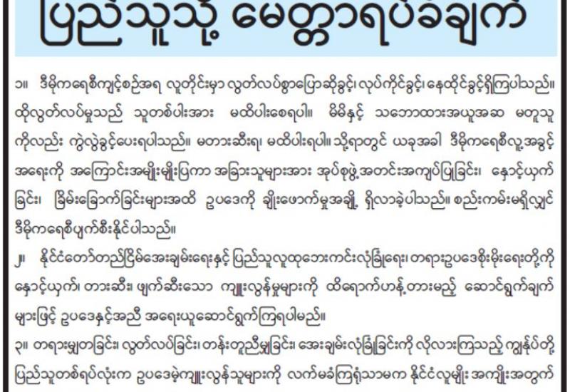 လက်ရှိအချိန်တွင် နိုင်ငံအတွင်းရှိ အချို့မြို့ကြီးများ၌ ဆူပူဆန္ဒပြမှုများ ဖြစ်ပေါ်လျက်ရှိပြီး ဆူပူလှုံ့ဆော်ဆန္ဒပြသူများအနေဖြင့် အစိုးရလုပ်ငန်းယန္တရား လည်ပတ်မှုကို အနှောင့် အယှက်ဖြစ် စေရန် လမ်းကြောင်းပိတ်ဆို့ခြင်းများ၊ ပုံမှန် လုပ်ငန်းတာဝန်ထမ်းဆောင်လျက်ရှိသည့် ဝန်ထမ်း များကို နှောင့်ယှက်ခြိမ်း ခြောက်ခြင်းများ စသည့် အဖျက်အမှောင့်လုပ်ရပ်များကို ပြုလုပ် လျက်ရှိ သည်။