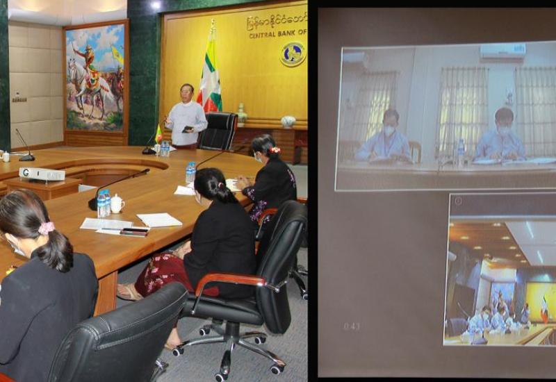 မြန်မာနိုင်ငံတော်ဗဟိုဘဏ် ရန်ကုန်ဘဏ်ခွဲနှင့် မန္တလေးဘဏ်ခွဲတို့ လုပ်ငန်းညှိနှိုင်း အစည်းအဝေးကို ယနေ့နံနက် ၁၁ နာရီတွင် နေပြည်တော်ရှိ ဒါရိုက်တာအစည်းအဝေးခန်းမ၌ ဗီဒီယိုကွန်ဖရင့် စနစ်ဖြင့် ကျင်းပရာ မြန်မာနိုင်ငံတော်ဗဟိုဘဏ်ဥက္ကဋ္ဌ ဦးသန်းညိန်း တက်ရောက်အမှာစကား ပြောကြားသည်။
