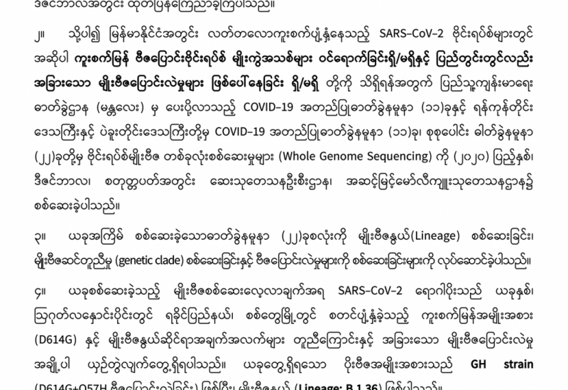 ၁။ ယူကေနိုင်ငံနှင့် ကမ္ဘာ့နိုင်ငံအချို့တွင် COVID-19 စစ်ဆေးတွေ့ရှိသော ဓာတ်ခွဲနမူနာများ၌ ကူးစက်ပျံ့နှံ့မှု ပိုမိုများပြားနိုင်သော မျိုးဗီဇပြောင်းလဲမှုရှိသည့် SARS-CoV-2 ဗိုင်းရပ်စ် မျိုးကွဲသစ် VUI202012/01(Lineage: B.1.1.7) နှင့် 501.V2 တို့ကို တွေ့ရှိရကြောင်း သက်ဆိုင်ရာနိုင်ငံများမှ (၂၀၂၀) ပြည့်နှစ်၊ ဒီဇင်ဘာလအတွင်း ထုတ်ပြန်ကြေညာခဲ့ကြပါသည်။