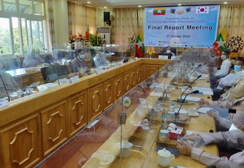 မြန်မာနိုင်ငံ၏ လမ်းပန်းဆက်သွယ်မှုနှင့် ပို့ဆောင်မှုကဏ္ဍ ဖွံ့ဖြိုးတိုးတက်စေရေး အတွက် ဆောက်လုပ်ရေး ဝန်ကြီးဌာန၊ လမ်းဦးစီးဌာနနှင့် KOICA Myanmar Office တို့ အကြား ပူးပေါင်းဆောင်ရွက်သည့် Feasibility Study on the Central Backbone Expressway in Myanmar( Yangon – Mandalay Expressway and Yangon - Ngayokekaung Expressway ) ၏ Final Report Meeting ကို ယနေ့ နံနက် ၉ နာရီခွဲတွင် လမ်းဦးစီးဌာန အစည်းအဝေး ခန်းမဆောင်မှ Video Conferencing စနစ်ဖြင့် ကျင်းပသည်။