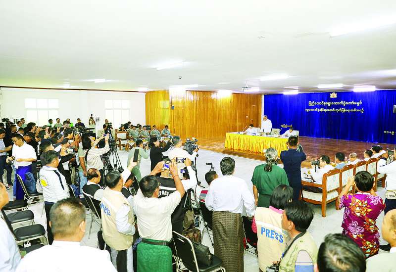 ပြည်ထောင်စုရွေးကောက်ပွဲကော်မရှင် ရွေးကောက်ပွဲဆိုင်ရာသတင်းထုတ်ပြန်ရေးအစီအစဉ်ကို ယနေ့မွန်းလွဲပိုင်းတွင် ပြည်ထောင်စုရွေးကောက်ပွဲကော်မရှင်ရုံး တိုးချဲ့ရုံးအဆောက်အအုံ၌ ကျင်းပရာ ပြည်ထောင်စုရွေးကောက်ပွဲကော်မရှင်အဖွဲ့ဝင် ဦးခင်မောင်ဦး၊ ဦးအောင်လွင်ဦးနှင့် ဦးမြင့်သိန်း၊ မြန်မာနိုင်ငံသတင်းမီဒီယာကောင်စီဥက္ကဋ္ဌ၊ ဒုတိယဥက္ကဋ္ဌ (၂) နှင့် တာဝန်ရှိသူများ၊ ပြည်ထောင်စုရွေးကောက် ပွဲကော်မရှင်ရုံးတာဝန်ရှိသူများ၊ ပြည်တွင်းမီဒီယာနှင့် ပြည်တွင်းအခြေစိုက် ပြည်ပမီဒီယာအဖွဲ့အစည်းများမှ သတင်းသမားများ တက်ရောက်သည်။