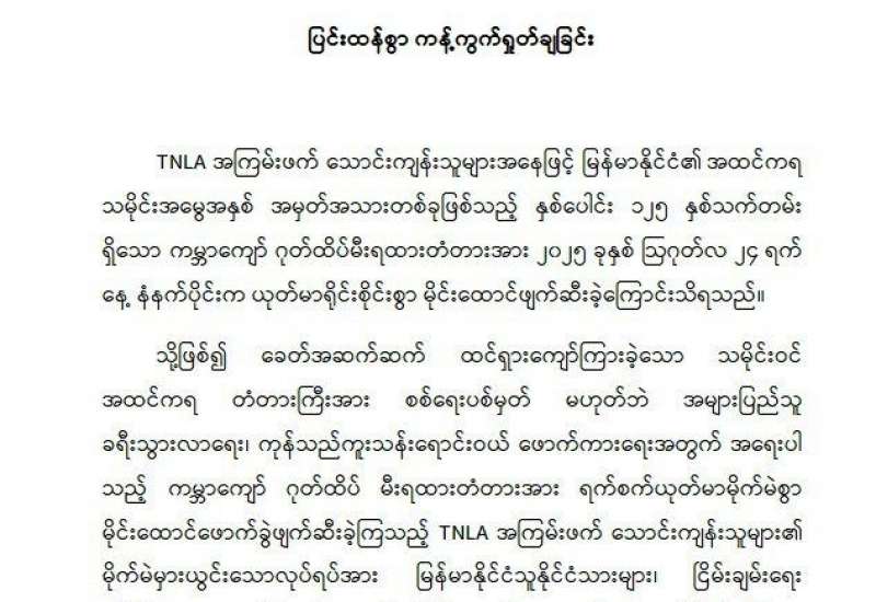 ရှမ်းပြည်နယ်(မြောက်ပိုင်း)၊ နောင်ချိုမြို့နှင့် ကျောက်မဲမြို့ကို ဆက်သွယ်ထားပြီး မန္တလေး-လားရှိုး ရထားလမ်းပေါ်၌တည်ရှိသည့် နှစ်ပေါင်း ၁၂၅ နှစ်သက်တမ်းရှိ ကမ္ဘာကျော်ဂုတ်ထိပ်မီးရထားလမ်းတံတားအား TNLA အကြမ်းဖက် သောင်းကျန်းသူများက စစ်ရေးနှင့်သက်ဆိုင်ခြင်းမရှိဘဲ ဆင်ခြင်တုံတရားကင်းမဲ့စွာ မိုင်းထောင်ဖောက်ခွဲဖျက်ဆီးခဲ့မှုအပေါ် ပြည်သူလူထုတစ်ရပ်လုံးက လုံးဝလက်ခံနိုင်ခြင်းမရှိဘဲ ကန့်ကွက်ရှုတ်ချ လျက်ရှိသည့်အပြင် အဖွဲ့အစည်းအသီးသီးကလည်း အဆိုပါအကြမ်းဖက်လုပ်ရပ် အပေါ်ပြင်းထန်စွာကန့်ကွက်ရှုတ်ချကြောင်း သဘောထားထုတ်ပြန်ချက်များကို ဩဂုတ် ၂၅ ရက်မှစ၍ အသီးသီးထုတ်ပြန်ခဲ့ကြသည်။