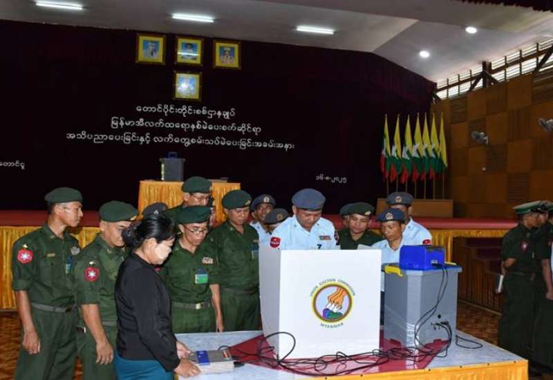 မြန်မာအီလက်ထရောနစ်မဲပေးစက် (MEVM) ဆိုင်ရာ အသိပညာပေးခြင်းနှင့် လက်တွေ့စမ်းသပ်မဲပေးခြင်းကို ယနေ့နံနက်ပိုင်းတွင် တောင်ပိုင်းတိုင်းစစ်ဌာနချုပ်၊ အေးချမ်းဖြိုးခန်းမ၌ပြုလုပ်ရာ တိုင်းမှူး ဗိုလ်ချုပ်ကြည်သိုက်နှင့် အဖွဲ့ဝင်များ၊ အရာရှိ၊ စစ်သည်၊ မိသားစုဝင်များ တက်ရောက်ကြသည်။
