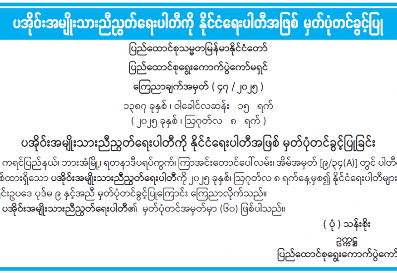 ပအိုဝ်းအမျိုးသားညီညွတ်ရေးပါတီကို နိုင်ငံရေးပါတီအဖြစ် မှတ်ပုံတင်ခွင့်ပြုခြင်း