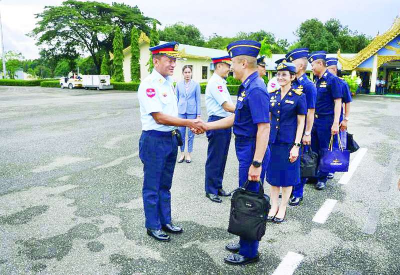 မြန်မာ - ထိုင်း နှစ်နိုင်ငံလေတပ်များအကြား အရာရှိကြီးများ အပြန်အလှန်လည်ပတ်ရေး အစီအစဉ်အရ ထိုင်းဘုရင့်လေတပ်မှ Air Marshal Srit Vuteerapol ဦးဆောင်သော ကိုယ်စားလှယ် အဖွဲ့သည် ဩဂုတ် ၄ ရက်တွင် ရန်ကုန်မြို့ မင်္ဂလာဒုံလေတပ်စခန်းဌာနချုပ်သို့ ရောက်ရှိကြရာ တပ်မတော်(လေ)မှ တာဝန်ရှိသူများက ကြိုဆိုကြသည်။
