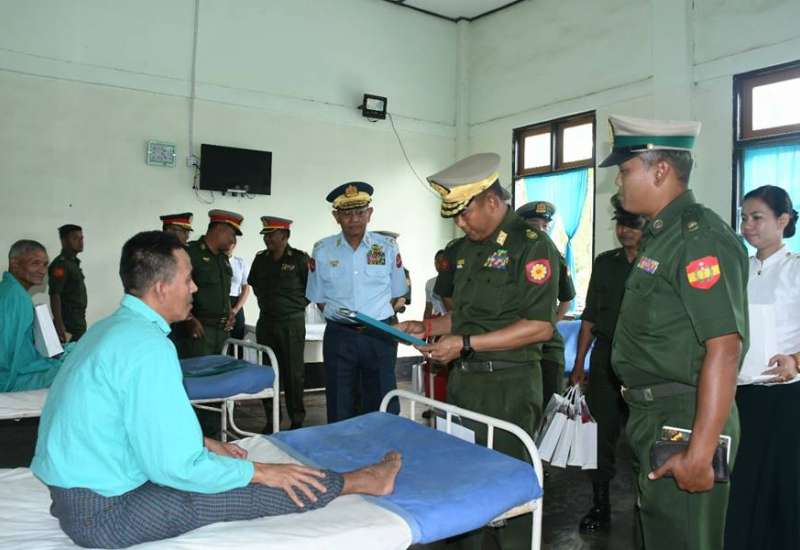 ကချင်ပြည်နယ်၊ မြစ်ကြီးနားမြို့ရှိတပ်မတော်ဆေးရုံ၊ ရှမ်းပြည်နယ်(တောင်ပိုင်း)၊ နမ့်စန်မြို့ရှိ တပ်မတော်ဆေးရုံ၊ တနင်္သာရီတိုင်းဒေသကြီး၊ ဘုတ်ပြင်းမြို့ရှိ တပ်မတော်ဆေးရုံ၊ ရန်ကုန်တိုင်းဒေသကြီး၊ မင်္ဂလာဒုံမြို့နယ်ရှိ တပ်မတော်အရိုးရောဂါ အထူးကုဆေးရုံကြီး(ခုတင်-၅၀၀)နှင့် တပ်မတော်ဆေးရုံကြီး(ခုတင်-၁၀၀၀)၊ ဧရာဝတီတိုင်းဒေသကြီး၊ ပုသိမ်မြို့ရှိ နယ်မြေခံဆေးတပ်ရင်း၊ ရခိုင်ပြည်နယ်၊ စစ်တွေမြို့ရှိတပ်မတော်ဆေးရုံ၊ မန္တလေးတိုင်းဒေသကြီး၊ မန္တလေးမြို့၊ နန်းမြို့တွင်းရှိ တပ်မတော်ဆေးရုံတို့၌ တက်ရောက်ဆေးကုသမှုခံယူလျက်ရှိသော အရာရှိ၊ စစ်သည်၊ မိသားစုဝင်များ၊ မြန်မာနိုင်ငံရဲတပ်ဖွဲ့ဝင်များ၊ ပြည်သူ့စစ်(ဌာနေ)တပ်ဖွဲ့ဝင်များ၊ စစ်မှုထမ်းဟောင်းအဖွဲ့ဝင်များနှင့် ဒေသခံပြည်သူများအား ယနေ့တွင် သက်ဆိုင်ရာတိုင်းစစ်ဌာနချုပ်များမှ တိုင်းမှူးများနှင့် တာဝန်ရှိသူများက သွားရောက်ကြည့်ရှု၍ တစ်ဦးချင်း၏ ရောဂါဖြစ်ပွားမှု၊ ဆေးဝါးကုသပေးထားမှုနှင့် ကျန်းမာရေးတိုးတက်ကောင်းမွန်မှုအခြေအနေများကို မေးမြန်းအားပေးစကား ပြောကြားပြီး အာဟာရဖြည့်စားသောက်ဖွယ်ရာများနှင့် ချီးမြှင့်ငွေများပေးအပ်ကာ ဆရာဝန်၊ သူနာပြုများအား ချီးမြှင့်ငွေများပေးအပ်ကြသည်။