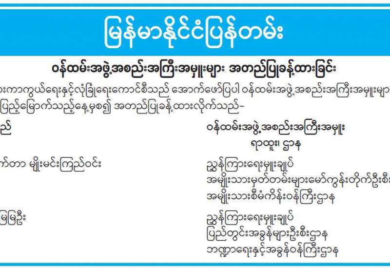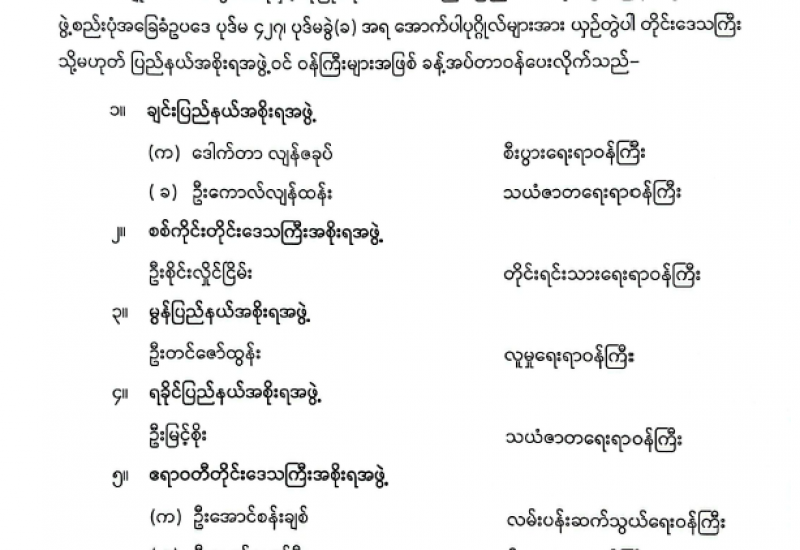 တိုင်းဒေသကြီး သို့မဟုတ် ပြည်နယ်အစိုးရအဖွဲ့ဝင် ဝန်ကြီးများ ခန့်အပ်တာဝန်ပေးခြင်း