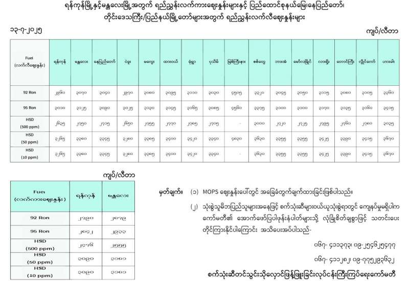 ရန်ကုန်မြို့နှင့် မန္တလေးမြို့အတွက် ရည်ညွှန်းလက်ကားဈေးနှုန်းများနှင့် ပြည်ထောင်စုနယ်မြေ နေပြည်တော်၊ တိုင်းဒေသကြီး/ပြည်နယ် မြို့တော်များအတွက် ရည်ညွှန်းလက်လီဈေးနှုန်းများ