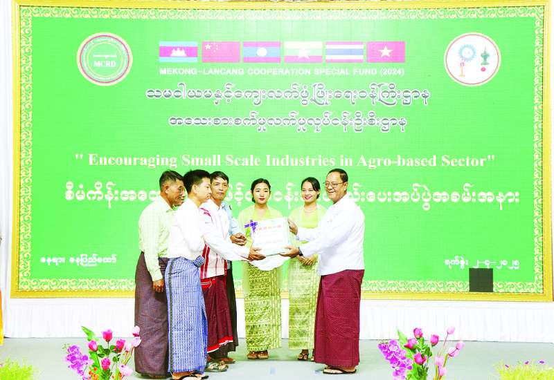 သမဝါယမနှင့်ကျေးလက်ဖွံ့ဖြိုးရေးဝန်ကြီးဌာန၊ အသေးစားစက်မှုလက်မှုလုပ်ငန်းဦးစီးဌာန၏ မဲခေါင်-လန်ချန်း ပူးပေါင်းဆောင်ရွက်မှုဆိုင်ရာ အထူးရန်ပုံငွေ (၂၀၂၄)ဖြင့် အကောင်အထည်ဖော်ဆောင်ရွက်ခဲ့သည့် စီမံကိန်းအထောက်အပံ့လုပ်ငန်းသုံးပစ္စည်းများ ပေးအပ်ပွဲအခမ်းအနားကို ယနေ့နံနက်ပိုင်းက ဝန်ကြီးဌာန စုပေါင်းအစည်းအဝေးခန်းမ၌ ကျင်းပရာ ပြည်ထောင်စုဝန်ကြီး ဦးလှမိုး၊ ဒုတိယဝန်ကြီး ဦးမြင့်စိုး၊ အမြဲတမ်းအတွင်းဝန်၊ ညွှန်ကြားရေးမှူးချုပ်များ၊ တာဝန်ရှိသူများနှင့် သင်တန်းသားများ တက်ရောက်ကြသည်။