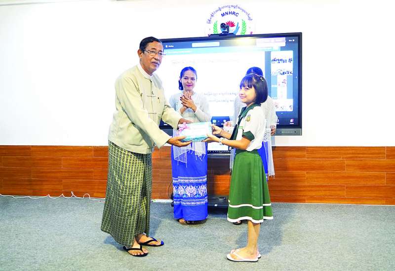 မြန်မာနိုင်ငံ အမျိုးသားလူ့အခွင့်အရေးကော်မရှင်ရုံးဝန်ထမ်းများ၏ အခြေခံပညာကျောင်းနေအရွယ် သားသမီးများ ဒုတိယအကြိမ် ပညာသင်စရိတ်ထောက်ပံ့ပေးအပ်သည့် အခမ်းအနားကို ယနေ့မွန်းလွဲပိုင်းတွင် ကော်မရှင်ရုံး၌ ပြုလုပ်ရာ ကော်မရှင်ဥက္ကဋ္ဌ၊ ကော်မရှင်အဖွဲ့ဝင်များ၊ ကော်မရှင်ရုံးဝန်ထမ်းများနှင့် ဝန်ထမ်းများ၏ အခြေခံပညာကျောင်းနေအရွယ်သားသမီးများ တက်ရောက်ကြသည်။