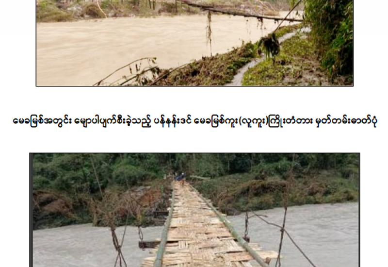 ကချင်ပြည်နယ်အတွင်း မိုးသည်းထန်စွာရွာသွန်းမှုကြောင့် နောင်မွန်းမြို့နယ်၊ နောင်မွန်း - ပန်နန်းဒင်သွား မေခမြစ်ကူး(လူကူး) ကြိုးတံတား အရှည် ၃၄၀ ပေ၊ အကျယ် ၆ ပေသည် မေလ ၃၁ ရက်တွင် မေခမြစ်ရေအဆမတန်မြင့်တက်မှုကြောင့် မြစ်အတွင်းမျောပါသွားခဲ့သည်။ အဆိုပါပန်နန်းဒင် မေခမြစ်ကူး(လူကူး) ကြိုးတံတားပျက်စီးခဲ့မှုအား ဌာနဆိုင်ရာတာဝန်ရှိသူများက အမြန်ဆုံးပြန်လည်ဆောက်လုပ်ခဲ့ရာ ဇွန်လ ၄ ရက်နေ့တွင် ဆောက်လုပ်ပြီးစီး၍ ဒေသခံပြည်သူများ ဖြတ်သန်းသွားလာနိုင်ပြီဖြစ်ကြောင်း သိရှိရသည်။