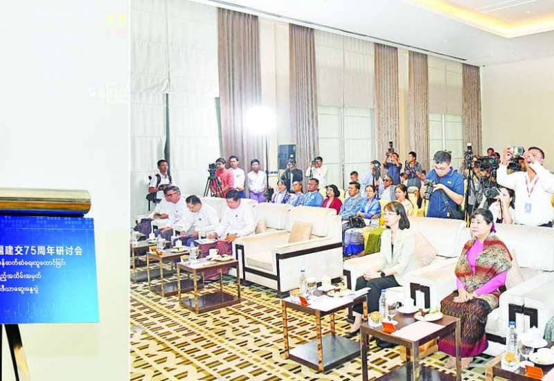 အနာဂတ်ဆီသို့ အတူလက်တွဲလျှောက်လှမ်းမည် မြန်မာ - တရုတ် သံတမန် ဆက်ဆံရေးထူထောင်ခြင်း (၇၅) နှစ်ပြည့် အထိမ်းအမှတ် နှစ်နိုင်ငံမီဒီယာဆွေးနွေးပွဲအခမ်းအနားကို ယနေ့နံနက်ပိုင်းတွင် နေပြည်တော်ရှိ Park Royal Hotel ၌ ကျင်းပသည်။
