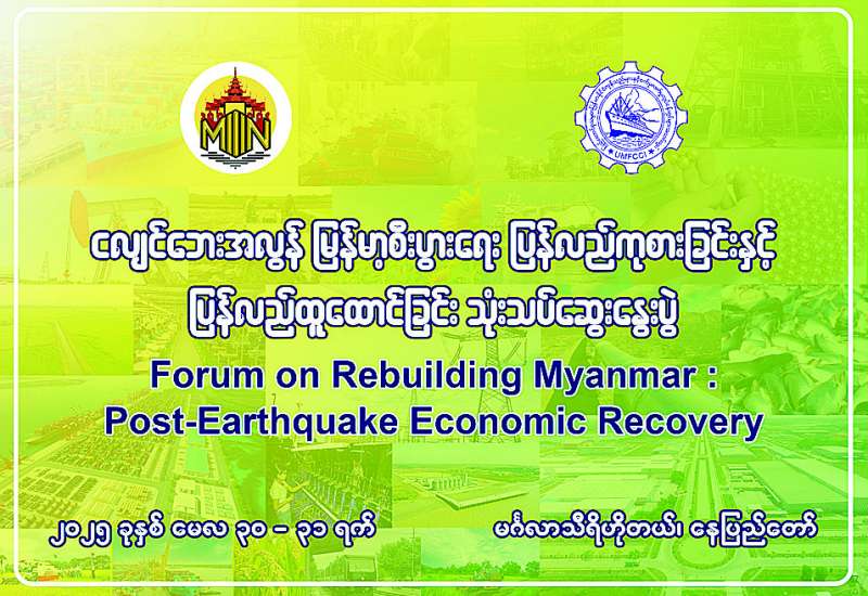 ပြန်ကြားရေးဝန်ကြီးဌာနနှင့် စီးပွားရေးနှင့်ကူးသန်းရောင်းဝယ်ရေးဝန်ကြီးဌာနတို့ ကြီးမှူး၍ မြန်မာ့ပုံရိပ်ဖော်ညွှန်းရေးအဖွဲ့(Myanmar Narrative Think Tank) က စီစဉ်ကျင်းပသော “ငလျင်ဘေးအလွန် မြန်မာ့စီးပွားရေးပြန်လည်ကုစားခြင်းနှင့် ပြန်လည်ထူထောင်ခြင်း” (Forum on Rebuilding Myanmar: Post-Earthquake Economic Recovery) သုံးသပ်ဆွေးနွေးပွဲကို မေ ၃၀ ရက်နှင့် ၃၁ ရက်တို့တွင် နေပြည်တော်ရှိ မင်္ဂလာသီရိဟိုတယ်၌ ကျင်းပမည်ဖြစ်သည်။