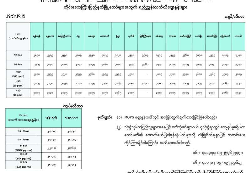 ရန်ကုန်မြို့နှင့် မန္တလေးမြို့အတွက် ရည်ညွှန်းလက်ကားဈေးနှုန်းများနှင့် ပြည်ထောင်စုနယ်မြေ နေပြည်တော်၊ တိုင်းဒေသကြီး/ပြည်နယ် မြို့တော်များအတွက် ရည်ညွှန်းလက်လီဈေးနှုန်းများ