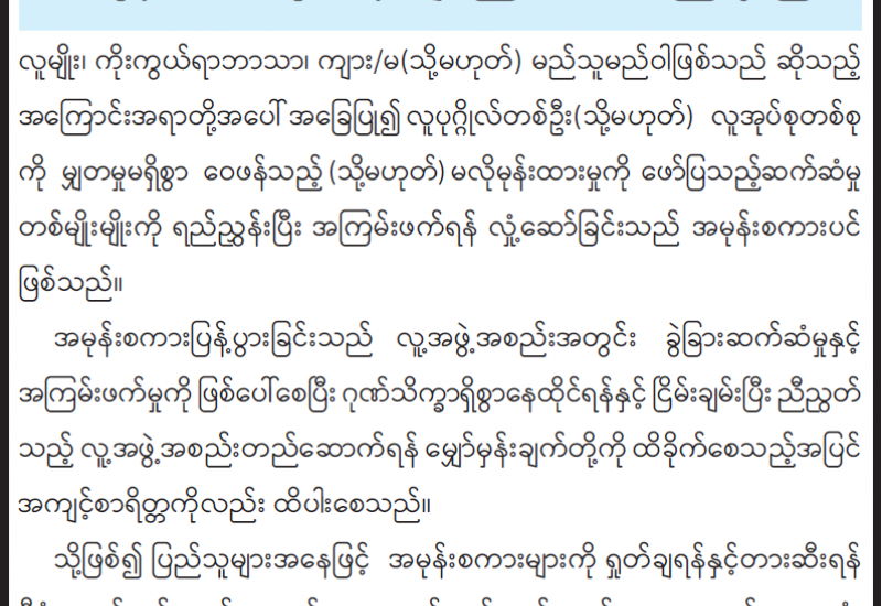 ၁။ ကျောင်းလခ၊ မိဘဆရာအသင်းကြေး၊ အားကစားကြေး၊ စာရေးကိရိယာကြေးနှင့် စာကြည့်တိုက်ကြေးအပါအဝင် မည်သည့်အခကြေးငွေကိုမျှ လုံးဝမကောက်ခံပါ။