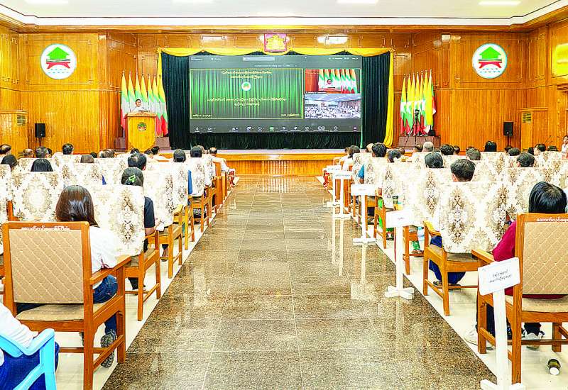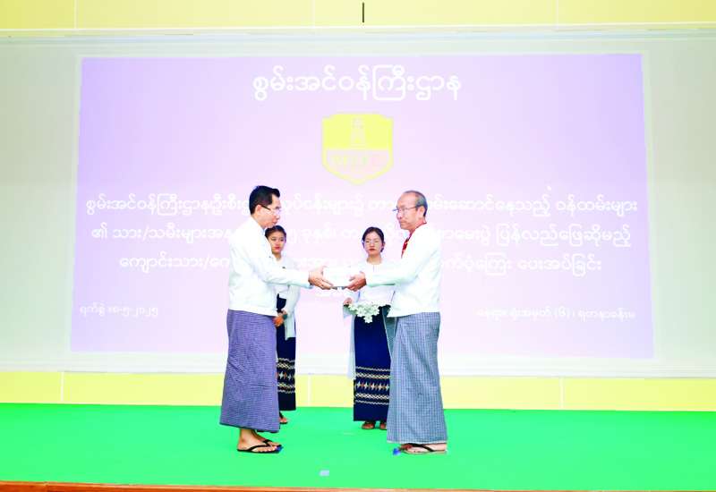 ၂၀၂၅ ခုနှစ် မတ် ၂၈ ရက်တွင် လှုပ်ခတ်ခဲ့သည့် မန္တလေးငလျင်ကြီးဒဏ်ကြောင့် ၂၀၂၅ ခုနှစ် တက္ကသိုလ် ဝင်စာမေးပွဲပြန်လည်ဖြေဆိုကြမည့် စွမ်းအင်ဝန်ကြီးဌာန ကြီးကြပ်မှုအောက်ရှိ ဦးစီးဌာန/လုပ်ငန်းများမှ ဝန်ထမ်းများနှင့် ဝန်ထမ်းသားသမီး ၄၀ တို့အတွက် ချီးမြှင့်ထောက်ပံ့ငွေ ပေးအပ်ခြင်းအခမ်းအနားကို ယနေ့နံနက်ပိုင်းက နေပြည်တော်ရှိ စွမ်းအင်ဝန်ကြီးဌာန ရတနာခန်းမ၌ကျင်းပရာ ပြည်ထောင်စုဝန်ကြီး၊ ဒုတိယဝန်ကြီး၊ ပြည်ထောင်စုဝန်ကြီးရုံး ညွှန်ကြားရေးမှူးချုပ်၊ ဝန်ကြီးဌာနကြီးကြပ်မှုအောက်ရှိ ဦးစီးဌာန/လုပ်ငန်းများမှ ညွှန်ကြားရေးမှူးချုပ်များ၊ ဦးဆောင်ညွှန်ကြားရေးမှူးများ၊ တာဝန်ရှိသူများ၊ တက္ကသိုလ်ဝင်စာမေးပွဲ ပြန်လည်ဖြေဆိုကြမည့် ကျောင်းသား ကျောင်းသူများနှင့် မိဘများ တက်ရောက်ကြသည်။
