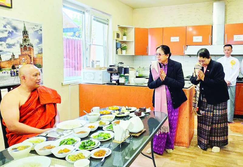 နိုင်ငံတော်စီမံအုပ်ချုပ်ရေးကောင်စီဥက္ကဋ္ဌ နိုင်ငံတော်ဝန်ကြီးချုပ် ဗိုလ်ချုပ်မှူးကြီး မင်းအောင်လှိုင်နှင့်အတူ ရုရှားဖက်ဒရေးရှင်းနိုင်ငံသို့ ရောက်ရှိနေသည့် ဇနီး ဒေါ်ကြူကြူလှသည် ကောင်စီတွဲဖက်အတွင်းရေးမှူး၏ဇနီး ဒေါ်နီလာ၊ ညှိနှိုင်း ကွပ်ကဲရေးမှူး (ကြည်း၊ ရေ၊လေ) ၏ ဇနီး၊ မြန်မာနိုင်ငံ အမျိုးသမီးရေးရာအဖွဲ့ချုပ် ဒုတိယဥက္ကဋ္ဌ ဒေါ်ခင်မေစိုး၊ ရုရှားဖက် ဒရေးရှင်းနိုင်ငံဆိုင်ရာ မြန်မာနိုင်ငံ သံအမတ်ကြီး၏ ဇနီးနှင့် တာဝန်ရှိသူများ လိုက်ပါ၍ ယနေ့ နံနက်ပိုင်းတွင် မော်စကို မြို့ရှိ မြန်မာထေရဝါဒ ဗုဒ္ဓဝိဟာရစင်တာသို့ သွားရောက်သည်။