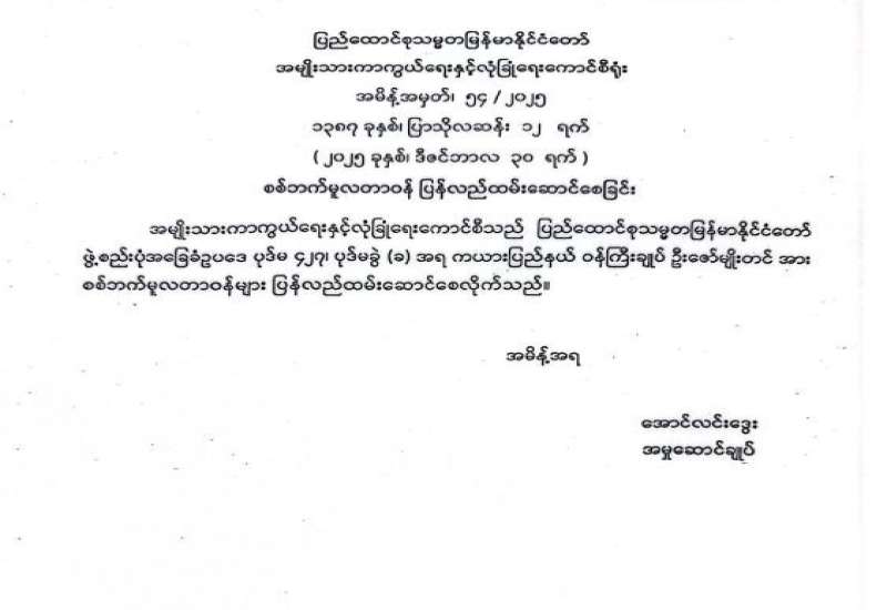 ငွေချေးသက်သေခံလက်မှတ်များ လဲလှယ်ရောင်းဝယ်ရေးဥပဒေကို ပြင်ဆင်သည့်ဥပဒေ(မူကြမ်း)နှင့် စပ်လျဉ်းသည့် ညှိနှိုင်းအစည်းအဝေးကို ယနေ့နံနက်ပိုင်းတွင် နေပြည်တော်ရှိ ဥပဒေရေးရာဝန်ကြီးဌာန အစည်းအဝေးခန်းမ၌ ကျင်းပရာ ဥပဒေရေးရာဝန်ကြီးဌာန ပြည်ထောင်စုဝန်ကြီးနှင့် ပြည်ထောင်စုရှေ့နေချုပ် ဒေါက်တာသီတာဦး၊ ဒုတိယဝန်ကြီးနှင့် ဒုတိယရှေ့နေချုပ် ဒေါက်တာ ထိန်လင်းဦး၊ ဘဏ္ဍာရေးနှင့်အခွန်ဝန်ကြီးဌာန ဒုတိယဝန်ကြီး ဦးဟန်ဝင်းအောင်၊ ဌာနဆိုင်ရာ တာဝန်ရှိသူများ တက်ရောက်ကြသည်။