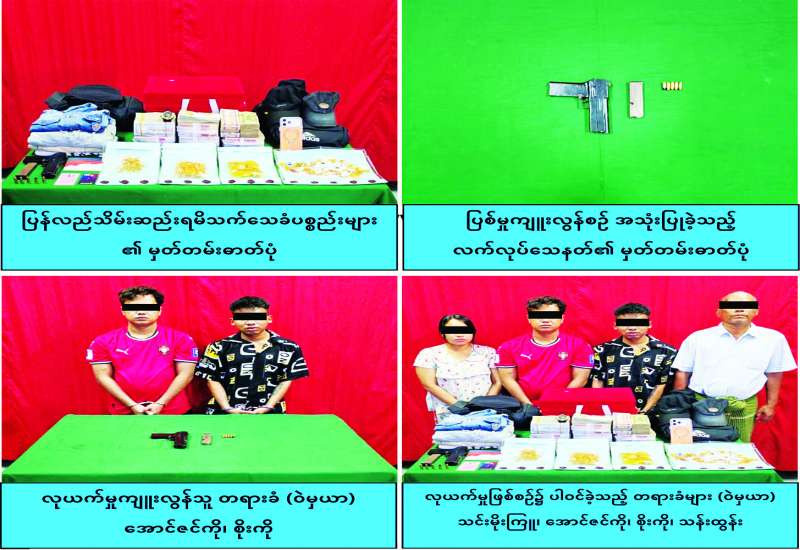 ရန်ကုန်တိုင်းဒေသကြီး လသာမြို့နယ် အမှတ် (၃) ရပ်ကွက် မဟာဗန္ဓုလလမ်းရှိ “ရွှေဇင်” အာမခံရွှေဆိုင်မှ ရွှေထည်ပစ္စည်းများနှင့် ငွေကျပ်သိန်း ၁၀၃၀ ကို ဒီဇင်ဘာ ၅ ရက်က သေနတ်ဖြင့်ခြိမ်းခြောက်၍ လုယက်ယူဆောင်ခဲ့သူများနှင့် ပူးပေါင်းပါဝင်သူတို့အား သက်သေခံပစ္စည်းများနှင့်အတူ ဖော်ထုတ်ဖမ်းဆီးရမိခဲ့ကြောင်း သိရသည်။