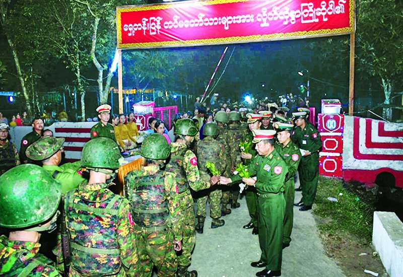 တိုင်းဒေသကြီးနှင့် ပြည်နယ်အသီးသီးရှိ တိုင်းရင်းသားပြည်သူများ စိတ်အေးချမ်းသာစွာ နေထိုင်လုပ်ကိုင်စားသောက်နိုင်ရန်နှင့် ပြည်သူလူထု၏ အသက်အိုးအိမ်စည်းစိမ်ဥစ္စာများကို ကာကွယ် စောင့်ရှောက်ရန်အတွက် နယ်မြေတည်ငြိမ်အေးချမ်းရေးနှင့် အကြမ်းဖက်ချေမှုန်းမှု စစ်ဆင်ရေး တာဝန်များကို ရှေ့တန်းစစ်မျက်နှာများတွင် မိဝေးဖဝေး၊ မိသားစုများနှင့် ဝေးကွာ၍ နေ့မအားညမနား စွမ်းစွမ်းတမံတာဝန်ထမ်းဆောင်ခဲ့ပြီး ရွပ်ရွပ်ချွံချွံတိုက်ပွဲဝင်ခဲ့သော အောင်ပွဲအလီလီရ ရှေ့တန်းပြန် နိုင်ငံ့သားကောင်း တပ်မတော်သားများအား ဂုဏ်ပြုကြိုဆိုခြင်းကို ယနေ့နံနက်ပိုင်းတွင် ရန်ကုန်တိုင်းဒေသကြီး လှည်းကူးမြို့နယ် အင်းတိုင်ကျေးရွာရှိ နယ်မြေခံတပ်ရင်း၌ ကျင်းပပြုလုပ်ရာ ရန်ကုန်တိုင်းစစ်ဌာနချုပ်မှ ဒုတိယ တိုင်းမှူး ဗိုလ်မှူးချုပ် ထွန်းထွန်းဦး၊ ဌာနဆိုင်ရာ တာဝန်ရှိသူများ၊ တပ်မတော်သားများ၊ မိသားစုဝင်များနှင့် ဒေသခံပြည်သူများက ဝမ်းမြောက်စွာ သောင်းသောင်းဖြဖြ ကြိုဆိုဂုဏ်ပြုကြသည်။