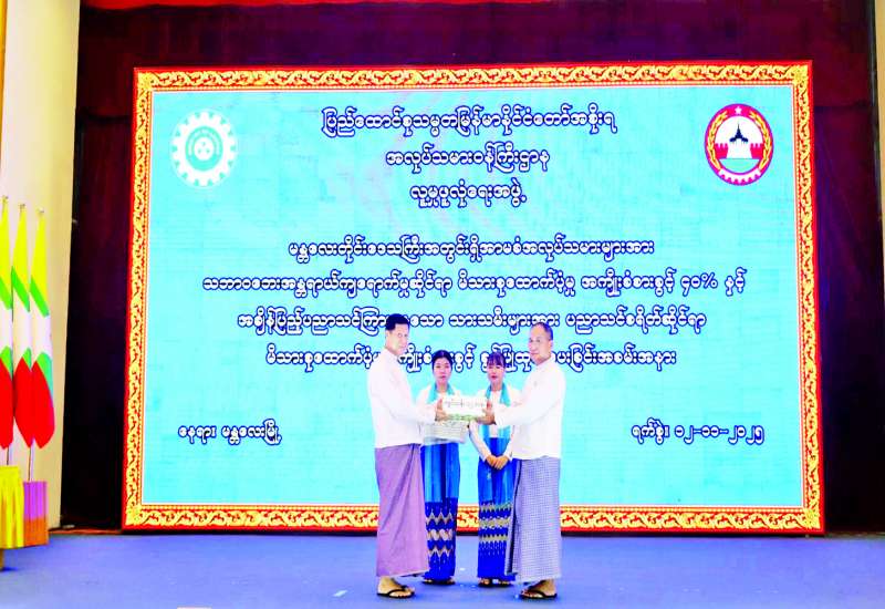 မန္တလေးတိုင်းဒေသကြီးအတွင်းရှိ အာမခံအလုပ်သမားများအား သဘာဝဘေးအန္တရာယ်ကျရောက်မှုဆိုင်ရာ မိသားစုထောက်ပံ့မှုအကျိုးခံစားခွင့်နှင့် သားသမီးများအား ပညာသင်စရိတ်ဆိုင်ရာ မိသားစုထောက်ပံ့မှု အကျိုးခံစားခွင့်ပေးအပ်ခြင်းကို ယနေ့နံနက်ပိုင်းတွင် မန္တလေးမြို့တော်ခန်းမ၌ ကျင်းပသည်။