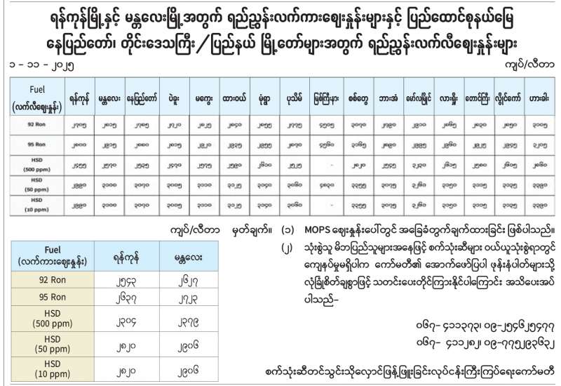 ရန်ကုန်မြို့နှင့် မန္တလေးမြို့အတွက် ရည်ညွှန်းလက်ကားဈေးနှုန်းများနှင့် ပြည်ထောင်စုနယ်မြေနေပြည်တော်၊ တိုင်းဒေသကြီး/ပြည်နယ် မြို့တော်များအတွက် ရည်ညွှန်းလက်လီဈေးနှုန်းများ