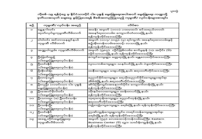 ပြည်ထောင်စုသမ္မတမြန်မာနိုင်ငံတော်အစိုးရ ကိုဗစ်-၁၉ ကြောင့် ဖြစ်ပေါ်လာနိုင်သည့် စီးပွားရေး သက်ရောက်မှုများအပေါ် ကုစားရေးလုပ်ငန်းကော်မတီ သတင်းထုတ်ပြန်ချက် (၆ / ၂၀၂၁) ၂၀၂၁ ခုနှစ်၊ ဒီဇင်ဘာလ ၁၄ ရက် ၁။ ကိုဗစ်-၁၉ ကြောင့် ဖြစ်ပေါ်လာနိုင်သည့် စီးပွားရေး သက်ရောက်မှုများအပေါ် ကုစားရေး လုပ်ငန်းကော်မတီ၏ အစည်းအဝေး အမှတ်စဉ် (၉/၂၀၂၁) ဆုံးဖြတ်ချက်အရ နိုင်ငံသားပိုင် ငါး၊ ပုဇွန် မွေးမြူရေးအပါအဝင် မွေးမြူရေးကဏ္ဍသို့ ချေးငွေ ထုတ်ပေးရန် လျှောက်ထားလာသည့် ကုမ္ပဏီ/ လုပ်ငန်းများအနက် ပူးတွဲစာရင်းပါ ကုမ္ပဏီ/ လုပ်ငန်း (၂၃၂) ခုသို့ ကိုဗစ်-၁၉ ရန်ပုံငွေမှ ချေးငွေ ထုတ်ယူခွင့်ပြုလိုက်သည်။