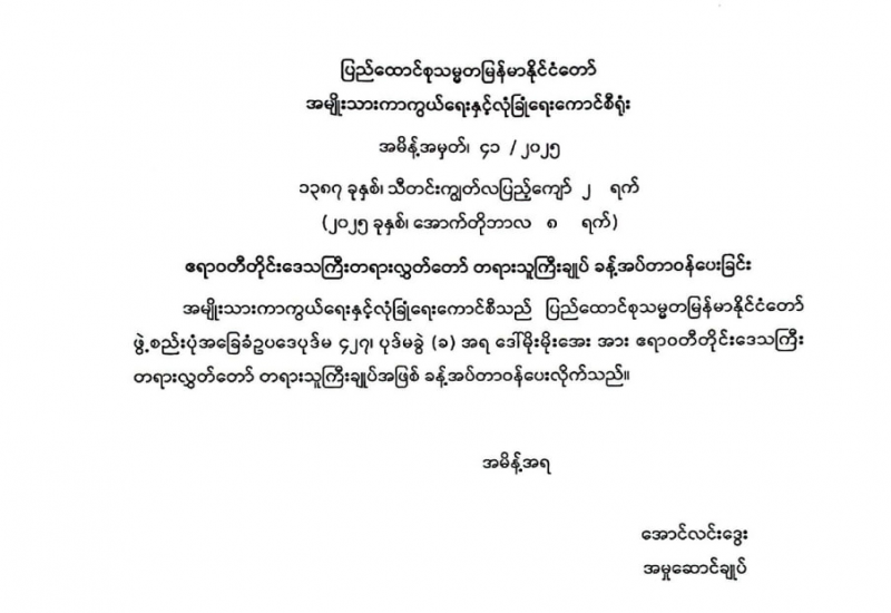 ပြည်ထောင်စုသမ္မတမြန်မာနိုင်ငံတော် ယာယီသမ္မတ နိုင်ငံတော်လုံခြုံရေးနှင့်အေးချမ်း သာယာရေးကော်မရှင် ဥက္ကဋ္ဌ၏ဇနီး ဒေါ်ကြူကြူလှ မြန်မာနိုင်ငံမိခင်နှင့် ကလေးစောင့် ရှောက်ရေးအသင်း (၃၄)ကြိမ်မြောက်နှစ်ပတ်လည်အစည်းအဝေး ဖွင့်ပွဲအခမ်းအနားတက်ရောက်