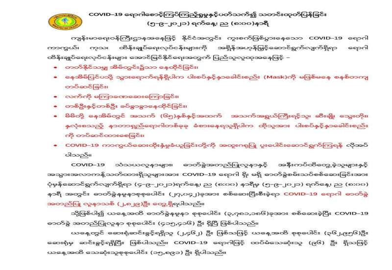 ကျန်းမာရေးဝန်ကြီးဌာနအနေဖြင့် နိုင်ငံအတွင်း ကူးစက်ဖြစ်ပွားနေသော COVID-19 ရောဂါ ကာကွယ်၊ ကုသ၊ ထိန်းချုပ်ရေးလုပ်ငန်းများကို အရှိန်အဟုန်မြှင့် ဆောင်ရွက်လျက်ရှိရာ ရောဂါ ထိန်းချုပ်ရေး လုပ်ငန်းများ အောင်မြင်နိုင်ရေးအတွက် ပြည်သူလူထုအနေဖြင့် -