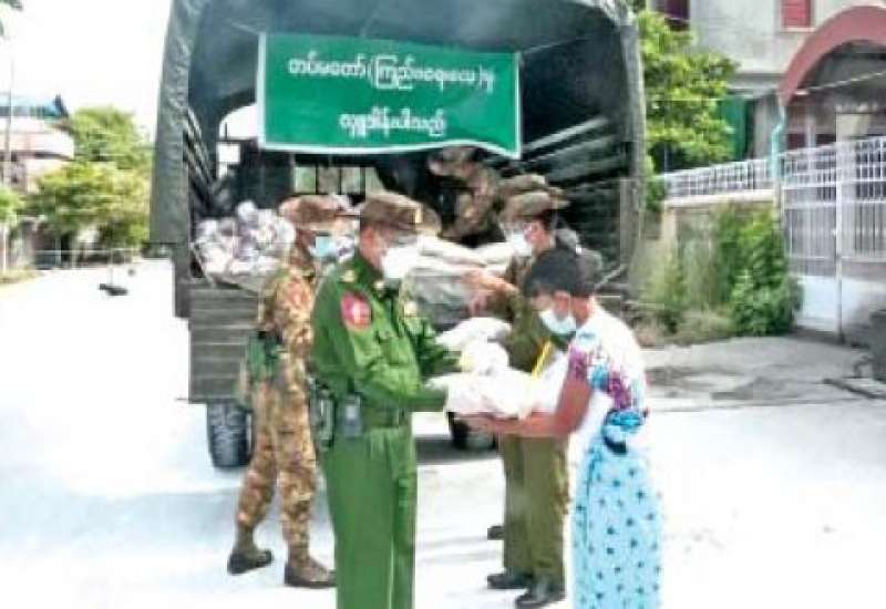 ကိုဗစ်- ၁၉ ရောဂါ ကာကွယ်၊ ထိန်းချုပ်၊ ကုသရေးလုပ်ငန်းများကို အရှိန် အဟုန်မြှင့် ဆောင်ရွက်လျက်ရှိရာ သွားလာမှုကန့်သတ်ချက်များကြောင့် စစ်မှုထမ်း ဟောင်းအဖွဲ့ဝင်များ၊ မြန်မာနိုင်ငံရဲတပ်ဖွဲ့ဝင်များ၊ ပြည်သူ့စစ်(ဌာနေ)တပ်ဖွဲ့ဝင်များ၊ ကျန်းမာရေးဝန်ထမ်းများ၊ စေတနာ့ဝန်ထမ်း Volunteerများနှင့် ဒေသခံပြည်သူများ စားရေးအဆင်ပြေစေရေးအတွက် တပ်မတော်နှင့် စေတနာရှင်အလှူရှင်များက စားသောက်ဖွယ်ရာများနှင့် ရောဂါ ကာကွယ်ရေးအထောက်အကူပြုပစ္စည်းများအား ထောက်ပံ့ပေးအပ်လျက်ရှိသည်။