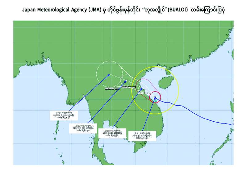 ယနေ့ညနေ ၃ နာရီခွဲတိုင်းထွာချက်များအရ တောင်တရုတ်ပင်လယ်ပြင်တွင်ဖြစ်ပေါ်နေသော တိုင်ဖွန်းမုန်တိုင်း “ဘူအလွိုင်” သည် အနောက်-အနောက်မြောက်ဘက်သို့ ရွေ့လျားလျက်ရှိပြီး ဗီယက်နမ်နိုင်ငံ ဒါနန်းမြို့၏ မြောက်-အရှေ့မြောက်ဘက်ရေမိုင် ၅၀ ခန့်နှင့် ဗင့်မြို့၏ အရှေ့တောင်ဘက် ရေမိုင် ၁၇၀ ခန့်အကွာ ပင်လယ်ပြင်ကို ဗဟိုပြုနေသည်။