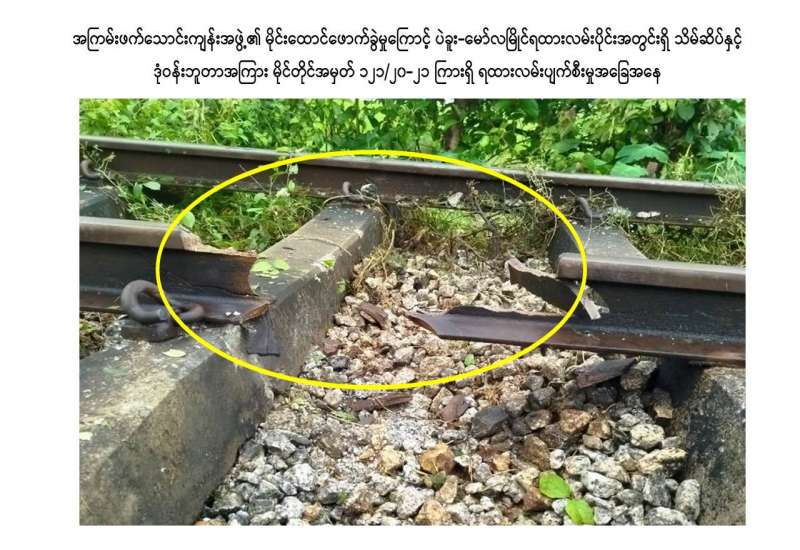 ယမန်နေ့ စက်တင်ဘာ ၂၆ ရက်နေ့ ည ၈ နာရီခွဲအချိန်ခန့်တွင် မွန်ပြည်နယ်၊ သထုံမြို့နယ်၊ သိမ်ဆိပ်ဘူတာနှင့် ဒုံဝန်းဘူတာအကြား၊ ပဲခူး-မော်လမြိုင် ရထားလမ်းပိုင်းအတွင်း မိုင်တိုင်အမှတ် ၁၂၁/၂၀-၂၁ ကြားရှိ ရထားသံလမ်းအား အကြမ်းဖက်သောင်းကျန်းသူအဖွဲ့က မိုင်းဖြင့်ဖောက်ခွဲဖျက်ဆီးထားသဖြင့် ရထားလမ်းထိခိုက်ပျက်စီးခဲ့ပြီး သိမ်ဆိပ်နှင့် ဒုံဝန်းအကြား ရထားလမ်းပိုင်းအား ယနေ့နံနက်ပိုင်းတွင် ယာယီပိတ်ထားရကြောင်း သိရှိရသည်။