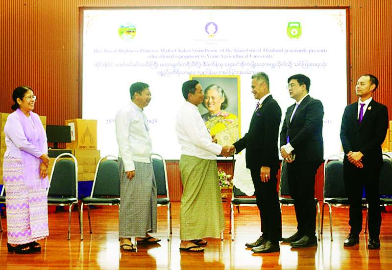 ထိုင်းနိုင်ငံ တော်ဝင်မင်းသမီးကြီး မဟာချက်ကရီသီရိဒုံစီမံကိန်းမှ သင်ကြားရေးနှင့် ရုံးလုပ်ငန်းပစ္စည်းကိရိယာများ လှူဒါန်းပေးအပ်ခြင်းအခမ်းအနားကို ယမန်နေ့ မွန်းလွဲပိုင်းတွင် ရေဆင်းစိုက်ပျိုးရေးတက္ကသိုလ် ရာပြည့်ခန်းမ၌ ကျင်းပရာ စိုက်ပျိုးရေး၊ မွေးမြူရေးနှင့် ဆည်မြောင်းဝန်ကြီးဌာန ဒုတိယဝန်ကြီး ဒေါက်တာတင်ထွဋ်၊ မြန်မာနိုင်ငံဆိုင်ရာ ထိုင်းနိုင်ငံသံအမတ်ကြီး H.E.Mr. Mongkol Visitstump နှင့် သံရုံးတာဝန်ရှိသူများ၊ စိုက်ပျိုးရေးတက္ကသိုလ် ပါမောက္ခချုပ်နှင့် ပါမောက္ခများ၊ ဆရာ ဆရာမများ တက်ရောက်ကြသည်။