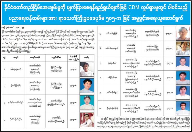 အကြမ်းဖက်ဆန္ဒပြရာတွင် ပါဝင်သောလူငယ်များအနေဖြင့် အဖျက်အမှောင့် ဆောင်ရွက် လိုသော လူတစ်စု၏သွေးဆောင်စည်းရုံးမှု၊ ချိတ်ဆက်ပေးမှုကြောင့် တိုင်းရင်းသား လက်နက်ကိုင်အဖွဲ့အစည်းတစ်ခု နယ်မြေအတွင်း၌ အကြမ်းဖက်ဖောက်ခွဲဖျက်ဆီးရေး သင်တန်းအား တက်ရောက်ပြီး ပြန်လည်ရောက်ရှိနေကြောင်း သတင်းပေးပို့ချက်များအရ လုံခြုံရေးတပ်ဖွဲ့ဝင်များက သက်ဆိုင်ရာနယ်မြေအလိုက် လုံခြုံရေးလုပ်ငန်းများအား အထူးကြပ်မတ်စစ်ဆေးဆောင်ရွက်ခဲ့သည်။