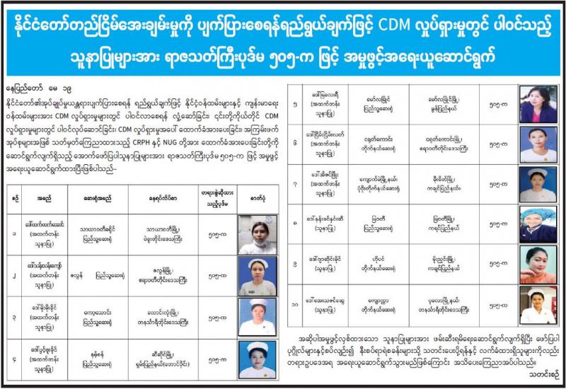 တပ်မတော်အနေဖြင့် ဆောင်ရွက်လျက်ရှိသည့် ပြည်သူ့အကျိုးပြု လုပ်ငန်းများအနက် ပြည်သူလူထုအတွက် အဓိကအကျဆုံးဖြစ်သော ကျန်းမာရေးကဏ္ဍ မြင့်မားရေးအတွက် တပ်မတော်မှပါရဂူများ၊ ဆေးမှူးများ၊ သူနာပြုများဖြင့် နယ်လှည့်ဆေးကုသ ရေးအဖွဲ့များ စုစည်း၍ ဒေသခံပြည်သူလူထုကို ကျန်းမာရေးစစ်ဆေးပေးခြင်း၊ လိုအပ်သည့် ကာကွယ်ဆေး များ ထိုးနှံပေးခြင်း၊ ခွဲစိတ်ရန်လိုအပ် သည့် လူနာများအား ခွဲစိတ်ကုသပေးခြင်း၊ ဆေးရုံ တက်ရောက်ကုသရန် လိုအပ်သော လူနာများကို ဆေးရုံတင်ကာ ကျန်းမာရေး စောင့်ရှောက် ပေးခြင်းများ ဆောင်ရွက်လျက်ရှိသည်။ ၎င်းအပြင် ပြည်သူလူထု၏ အရေးပေါ် ကျန်းမာရေး ဆိုင်ရာကုသမှုများ ဆောင်ရွက်ပေးနိုင်ရန်အတွက် တပ်မတော်ဆေးရုံများနှင့် ယာယီကုသရေး ဆေးရုံများတွင် ကျန်းမာရေး စောင့်ရှောက်မှုများကို နေ့ညမပြတ် ဆောင်ရွက်ပေး လျက်ရှိရာ ဖေဖော်ဝါရီ ၅ ရက်မှ ယနေ့အထိ ပြင်ပလူနာပေါင်း ၂၁၁၁၈၆ ဦးနှင့် အတွင်းလူနာပေါင်း ၆၄၄၃၉ ဦးတို့ကို ကုသပေးနိုင်ခဲ့သည်။