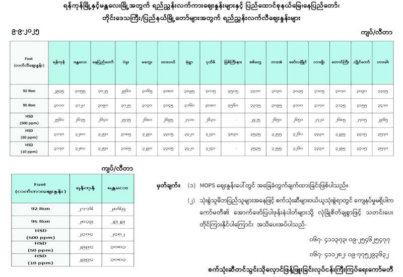 ရန်ကုန်မြို့နှင့် မန္တလေးမြို့အတွက် ရည်ညွှန်းလက်ကားဈေးနှုန်းများနှင့် ပြည်ထောင်စုနယ်မြေ နေပြည်တော်၊ တိုင်းဒေသကြီး/ပြည်နယ် မြို့တော်များအတွက် ရည်ညွှန်းလက်လီဈေးနှုန်းများ