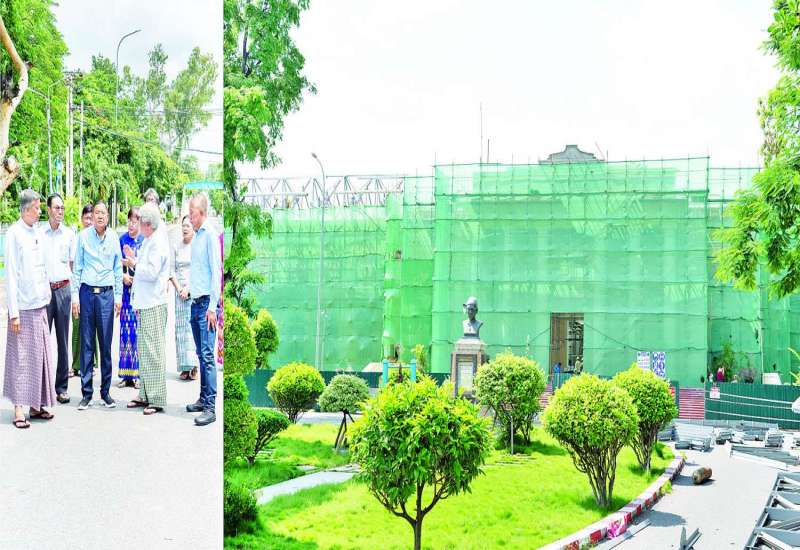 ဆောက်လုပ်ရေးဝန်ကြီးဌာန ဒုတိယဝန်ကြီး ဦးမျိုးမြင့်သည် မန္တလေးတက္ကသိုလ် ပင်မဆောင်မူလပုံစံမပျက် ပြန်လည်ပြုပြင်တည်ဆောက်နိုင်ရေးဗိသုကာဆိုင်ရာ လုပ်ငန်းကြီးကြပ်မှုကော်မတီဥက္ကဋ္ဌ ဦးဝင်းဇော်၊ ဒုတိယပါမောက္ခချုပ်၊ တာဝန်ရှိသူများနှင့်အတူ ယမန်နေ့က မန္တလေးတက္ကသိုလ်ပြန်လည်တည်ဆောက်ရေးလုပ်ငန်းများ ဆောင်ရွက်နေမှုကို ကြည့်ရှုစစ်ဆေးရာ မြန်မာမြို့ပြနှင့် အခြေခံအဆောက်အအုံ ဖွံ့ဖြိုးရေးလုပ်ငန်းရှင်များအသင်း (MDA)မှ တာဝန်ရှိသူများက မန္တလေးတက္ကသိုလ်ပင်မဆောင်၏ ဗိသုကာပုံစံနှင့် လက်ရှိပျက်စီးမှုအခြေအနေ၊ မူလပုံစံမပျက်ပြန်လည်ပြုပြင်တည်ဆောက်ခြင်းလုပ်ငန်းများ ဆောင်ရွက်နေမှုတို့ကို ရှင်းလင်းတင်ပြကြသည်။